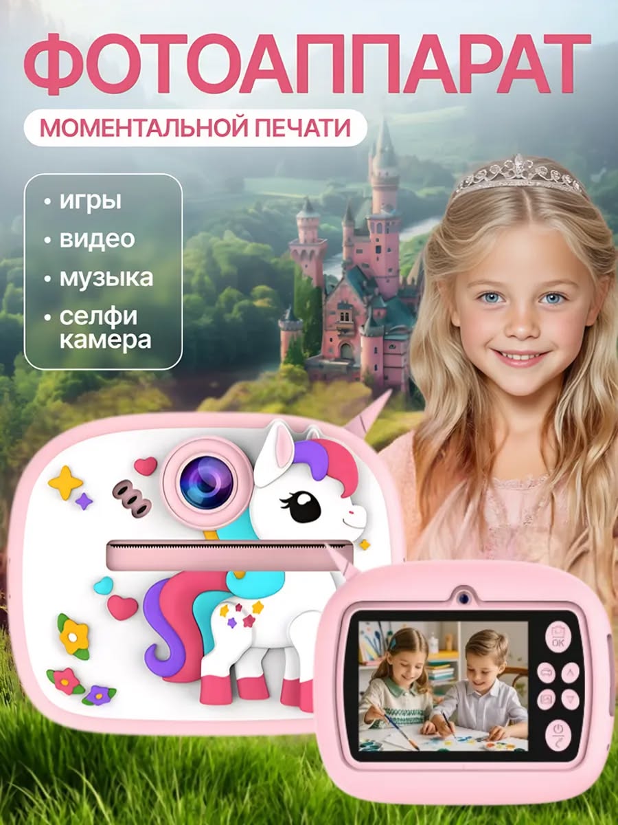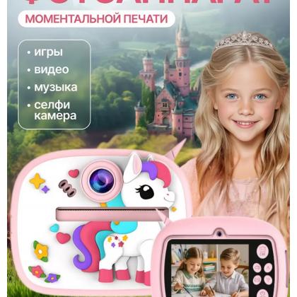 Цифровой фотоаппарат с мгновенной печатью обладает ярким и креативным дизайном всеми любимым персонажем единорога, который понравится каждому ребенку. Детский подарок станет отличной игрушкой для девочек в путешествиях, на прогулках, день рождениях и детских вечеринках.